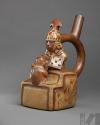 DescripciónBotella gollete de asa estribo con representación de sacerdote con tocado y orejeras frente a prisionero, sobre base escalonadaESTATUS