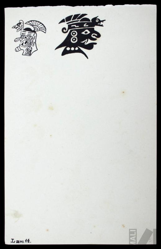 DescripciónObra de formato rectangular vertical. Composición en base a estudio de dos cabezas. En la parte superior izquierda, cabeza de perfil a la derecha con tocado, una forma zoomorfa de perfil descansa sobre su cabeza, lleva orejeras y un collar, a su lado izquierdo, una cabeza de perfil a la izquierda con tocado y una forma zoomorfa de perfil sobre su cabeza, líneas que recorren su rostro y orejeras. En la parte inferior izquierda tiene escrito: “LAM. 14.”