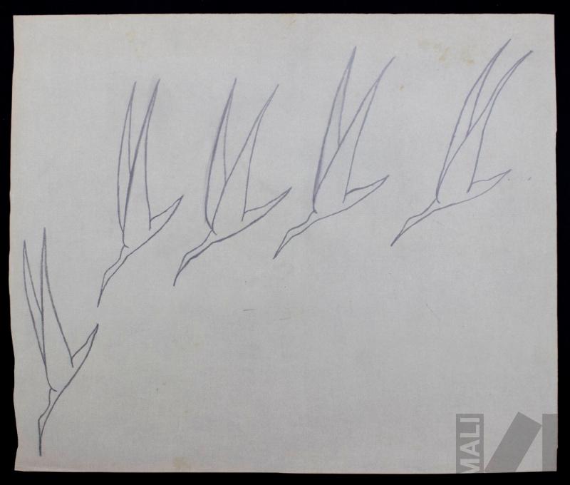 Obra de formato rectangular horizontal. Composición en base a representación de cinco aves dispuestas una tras de otra formando una curva. Se encuentran de perfil a la izquierda y tiene las alas extendidas hacia arriba.