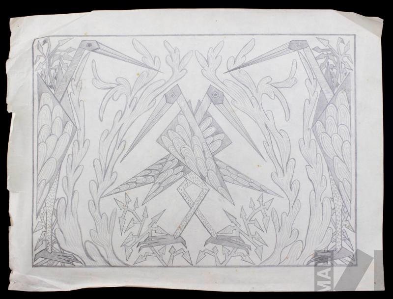 DescripciónObra de formato rectangular horizontal. Representación de cuatro aves con el pico largo y recto, cuello largo y alas con diseño de figuras ovoidales, rodeadas de follaje: dos aves ubicadas al centro entrecruzadas con los picos hacia los extremos. Y hacia los extremos uno ave a cada lado enfrentadas.