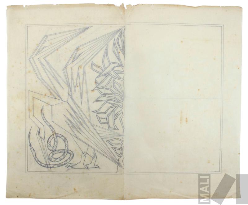 DescripciónObra de formato rectangular horizontal. Composición en base a un ave geometrizada con el pico largo y recto, alas con decoración de líneas. Con su pico sostiene una serpiente, se observa follaje a la derecha. La composición solo ocupa la mitad de la obra.ESTATUS