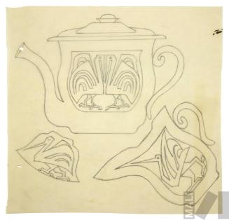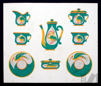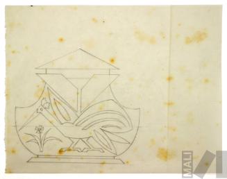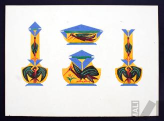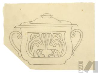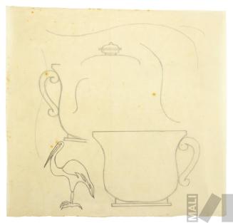 DescripciónObra en formato rectangular vertical. Composición en base a una jarra con el asa maciza, cuyo cuerpo tiene decoración de gota y tapa con diseños lobulares y terminación en esfera. En la parte superior en el centro un recipiente con asa maciza, boca ancha de forma irregular y el cuerpo con decoración de gota. Al extremo superior derecho un recipiente con el cuerpo compuesto, decoración ovoidal y tapa con terminación en bola hacia la izquierda.ESTATUS