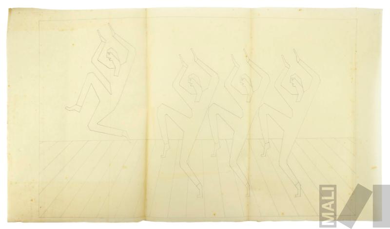DescripciónObra de formato rectangular horizontal. Composición en base a cuatro figuras masculinas. Tienen los brazos flexionados levantados sobre la cabeza, las piernas flexionadas, la pierna derecha está levantada del suelo. La figura del extremo izquierdo esta totalmente separado el suelo.