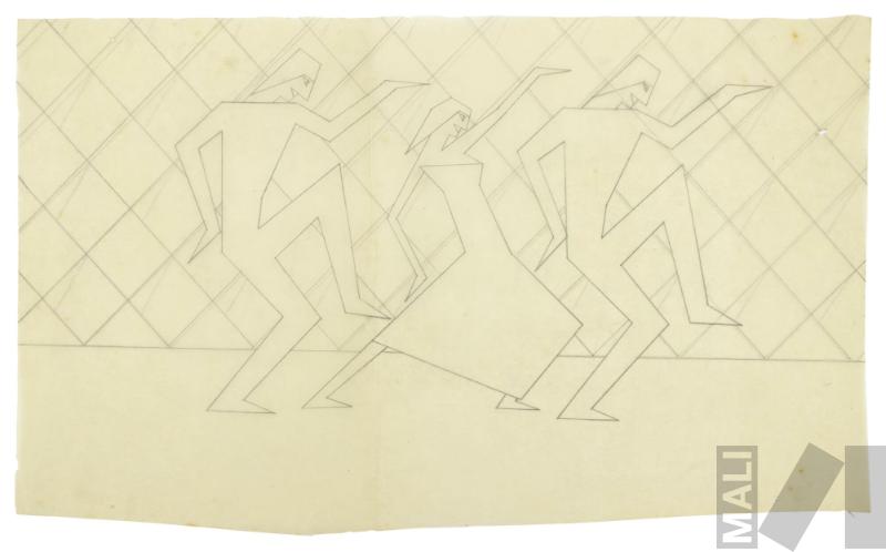 DescripciónObra de formato rectangular horizontal. Composición a base de tres figuras estilizadas de cuerpo entero y posición de tres cuartos a la derecha. Una femenina con una de sus piernas estirada hacia atrás y la otra flexionada hacia adelante, uno de sus brazos levantados por encima de su cabeza hacia adelante y el otro flexionado hacia atrás, viste un vestido largo sin tirantes. A cada lado un hombre con las piernas flexionadas, una de sus piernas levantada; uno de sus brazos va hacia adelante y el orto está flexionado hacia atrás. El fondo lo compone una pared de rombos.