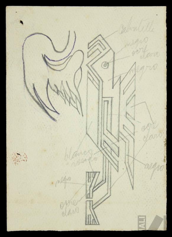DescripciónObra de formato rectangular vertical. Composición en base a una figura zoomorfa. En la derecha un ave estilizada de perfil hacia la izquierda; tiene las garras y el cuerpo geometrizado; su pico es aguileño. Señalando las partes del ave hay inscripciones: señalando el pico: "CABRITILLA", señalando el ojo: "NEGRO" y "OCRE/CLARO", señalando el cuello: "NEGRO", señalando las alas, el cuerpo y las patas: "OCRE/CLARO", señalando las alas: "NEGRO", señalando el pecho: "BLANCO", señalando las garras y la cola: "ROSADO", señalando las garras: "NEGRO" y "OCRE/CLARO". En la parte superior izquierda el cuerpo de un ave y una marca de agua.