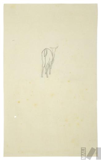 DescripciónObra de formato rectangular vertical. Composición en base a ciervo de medio cuerpo en posición de perfil. Tiene la pata delantera derecha flexionada hacia atrás. Tiene cuernos.ESTATUS