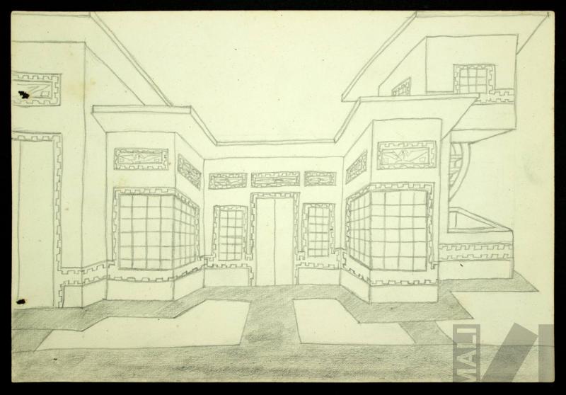 DescripciónObra de formato rectangular horizontal. Composición en base a fachada arquitectónica vista frontalmente y en perspectiva. La puerta esta flanqueada por dos ventanas y dos volúmenes con otras dos ventanas. Las ventanas están enmarcadas por una greca y toda la fachada tiene en la parte superior elementos rectangulares con formas geométricas. En la parte izquierda se eleva un volumen rectangular y en la parte derecha dos volúmenes, un en el primer piso y otro en un segundo piso