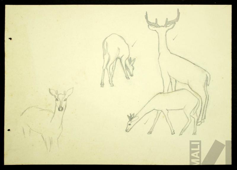 DescripciónObra de formato rectangular horizontal. Composición en base a estudio de cuatro figuras de venados o ciervos. En la lado izquierdo en medio cuerpo en tres cuartos a la derecha y la cabeza frontal. En la parte central en cuerpo entero en tres cuartos a la derecha hacia atrás con la cabeza hacia abajo. En lado derecho dos venados en diferentes planos, el primero se encuentra de perfil a la izquierda con la cabeza hacia abajo y el segundo está en tres cuartos a la izquierda hacia atrás con la parte de adelante elevada