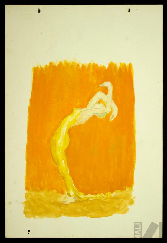 DescripciónObra de formato rectangular vertical. Composición en base a figura femenina, en posición de perfil, tiene el cuerpo y la cabeza inclinado hacia atrás con los brazos flexionados sobre la cabeza. Lleva vestido amarillo. El fondo es anaranjado y el piso amarillo