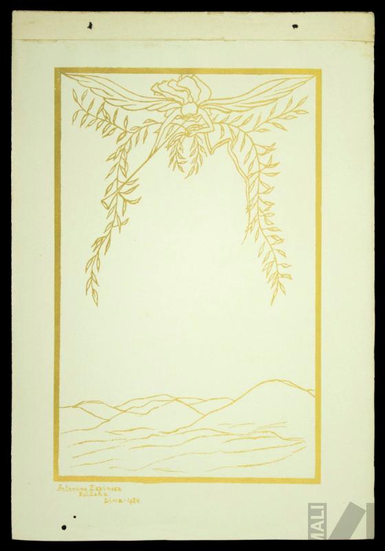 DescripciónObra de formato rectangular vertical. Composición en base a montañas y ángel. El ángel se encuentra en la parte superior en vuelo en posición frontal y perpendicular al espectador, tiene las alas extendidas y con una trompeta larga de manera diagonal, bajo el ángel cuelgan laureles. En la parte inferior se representa pequeñas montañas. Todo el diseño esta enmarcado en un marco rectangular vertical y de color doradoESTATUS