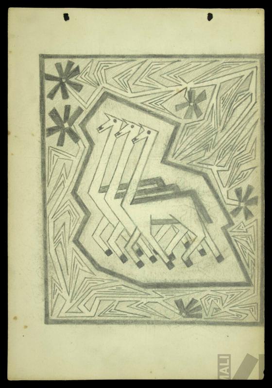 DescripciónObra de formato rectangular vertical. Composición en base a tres llamas colocadas en superposición de planos, todos en perfil a la izquierda. Está enmarcada por una forma irregular rodeado por follaje con flores en diseños geométricos y estos a su vez están enmarcados en una figura rectangular vertical