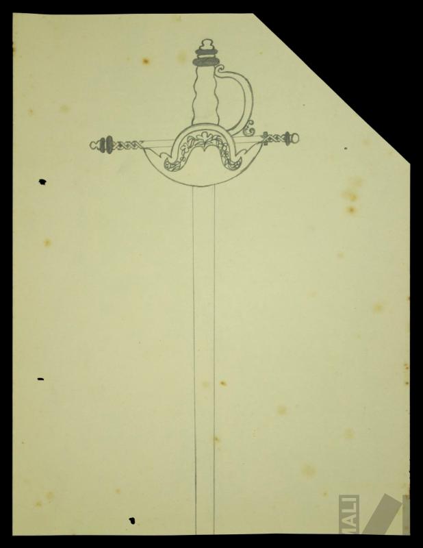 DescripciónObra de formato rectangular vertical. Una de las esquinas está cortada. Composición en base a espada dispuesta de forma vertical cuya punta esta cortada. La guarda tiene forma semicircular con decoraciones florales de la que se extiende una varilla o gavilán cuyos extremos están decorados y terminan en bola. El puño con los bordes ondeados, y pomo en forma de bola.