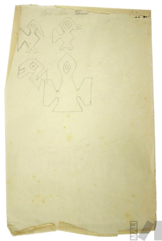 DescripciónObra de formato rectangular vertical. Composición en base a dos aves geometrizadas ubicadas en la parte superior de perfil a la derecha la de la izquierda tiene cabeza romboide, ojo almendrado, pico largo hacia abajo y ala triangular, a su costado ave con la cabeza poligonal, ojo romboide, pico corto, cuerpo romboide y ala triangular. Seguidamente en la parte inferior a la izquierda una cabeza zoomorfa de perfil con ojos y boca romboide y del cuello sale un apéndice; a su costado una figura acampanada que en su parte superior tiene polígonos concéntricos, y a la altura de su cuerpo se abren hacia los extremos una extinción a cada lado en forma triangular.
