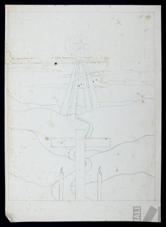 DescripciónObra de formato rectangular horizontal. Composición en base a embarcación de tres mástiles, con tres banderas y cuatro velas, en la vela mayor tiene una cruzESTATUS