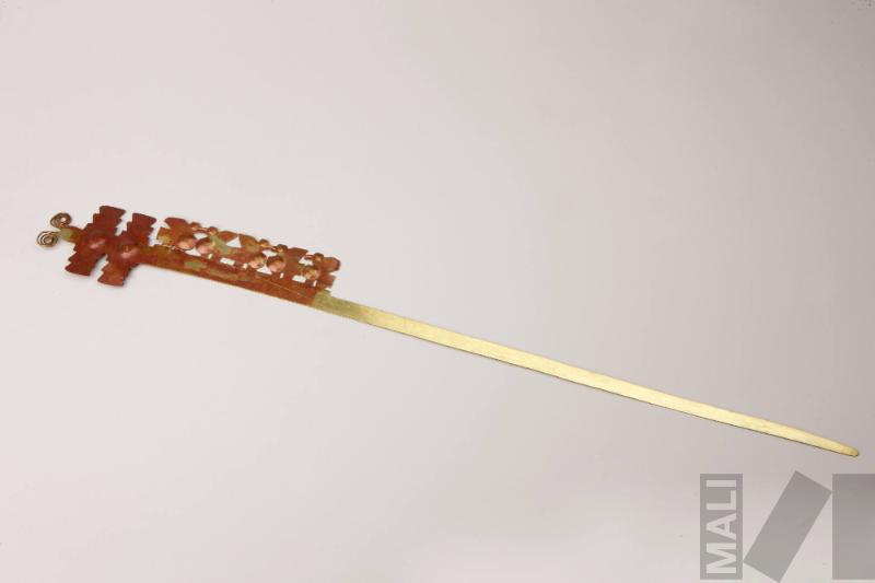 DescripciónAdorno decorado con diseños de aves, motivos geométricos y de espiral