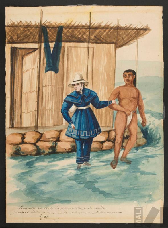 Señora en traje de pinganilla o de moda, yendo al baño de mar en Chorrillos con un indio nadador