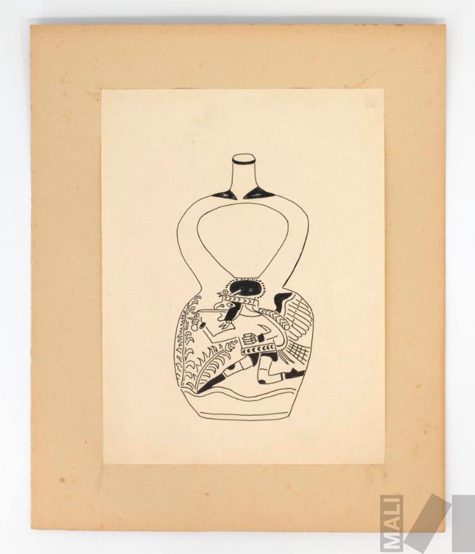DescripciónObra en formato rectangular vertical. Composición en base a representación de cerámica bicromática decorada con motivo de guerrero mochica.
