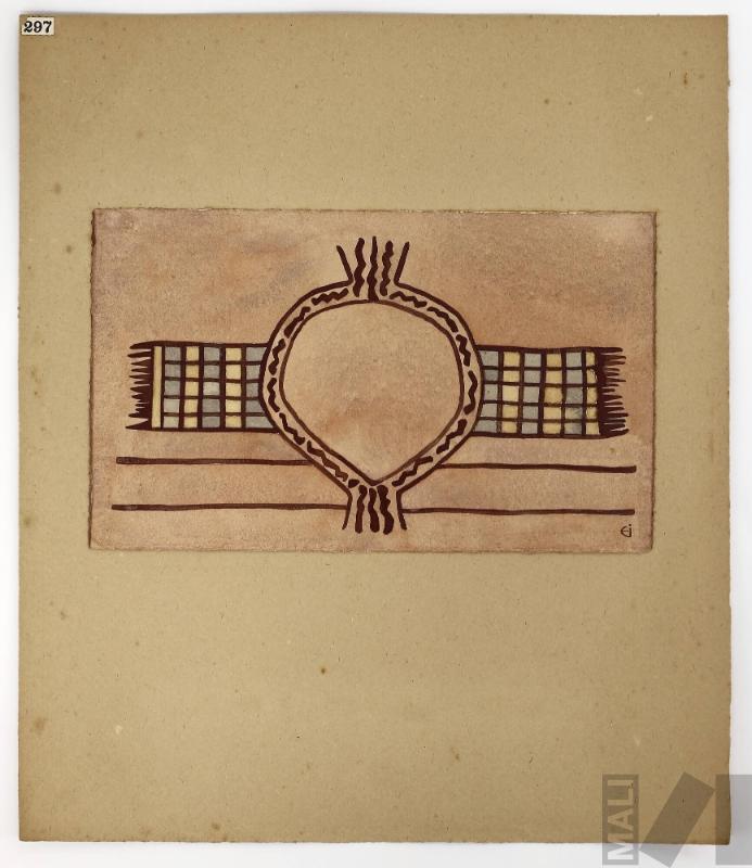 DescripciónObra en formato rectangular horizontal. Composición en base a representación sencilla de objeto ornamental decorado con líneas ondeadas y cuadriculadas.ESTATUS