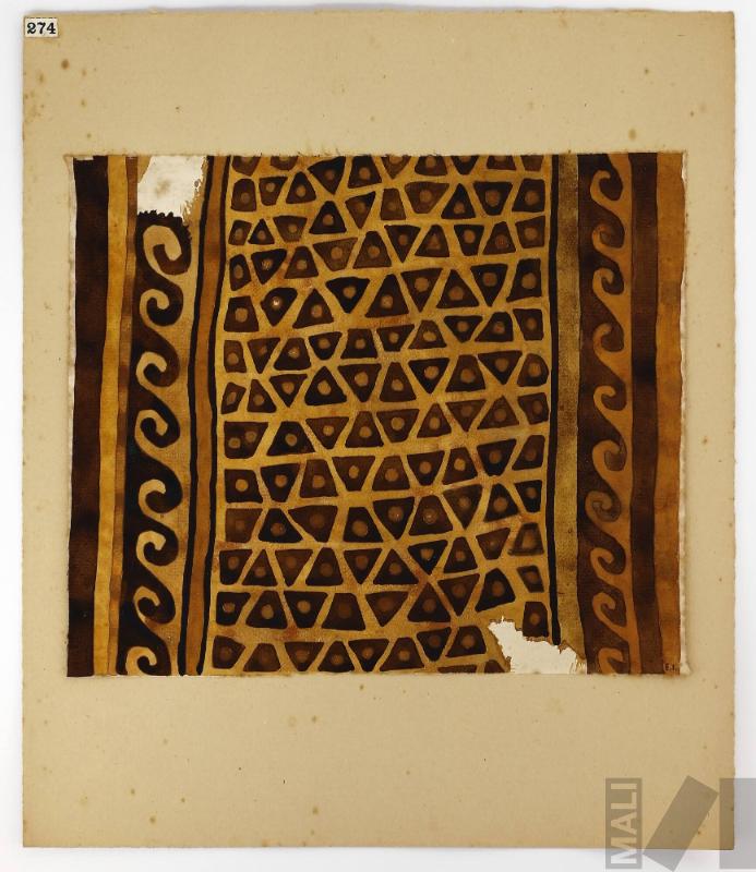 DescripciónObra en formato rectangular horizontal. Composición en base a representación de textil prehispánico en tonalidades marrones y mostaza, decorado con formas triangulares y trapezoidales al centro y olas a los lados.ESTATUS