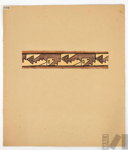 DescripciónObra en formato rectangular horizontal. Composición en base a representación de cinco diseños zoomorfos de forma zigzagueante, tres aves de color marrón y otras dos de color amarillo. Con diseños lineales en la parte superior e inferior.ESTATUS