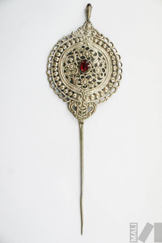 DescripciónTupu. La parte superior es circular con decoración floral calada y una piedra preciosa roja al centro. Además está rematada por un objeto en forma de cucurucho sobre el que hay otra piedra preciosa morada. La parte inferior termina en un alfiler.