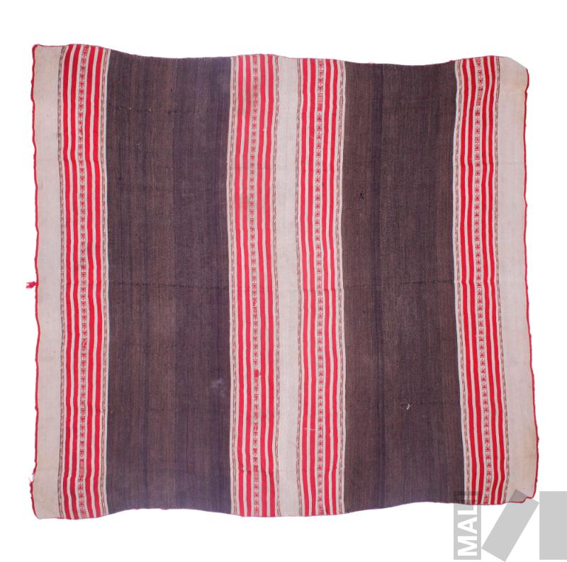DescripciónTejido llano en fibra de alpaca con cara de urdimbre y urdimbre suplementaria flotante pampa jaspeada (japi) morado (2) amarillo (1); bordes blanco con rayita roja;saltas rojo y blanco, verde y blanco; ribete rojo; trama rosado/café; saltas casas con cerro y banderilla ribete tejido que tiene una borla al final
