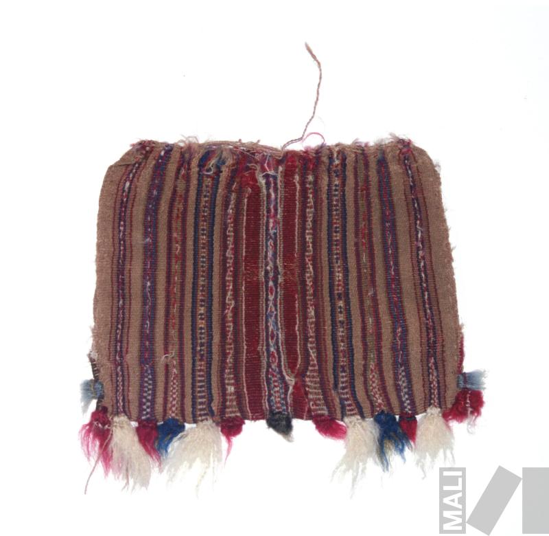 DescripciónTejido llano en fibra de alpaca con cara de urdimbre y saltas con urdimbre complementaria simple y de tres colores; pampa beige; rayas azul, rosado oscuro, verde, morado, turquese; flecos de los mismos colores, ribete parcial rosado oscuro; trama beige; saltas geométricas de 2 y 3 pares; flecos como adornos