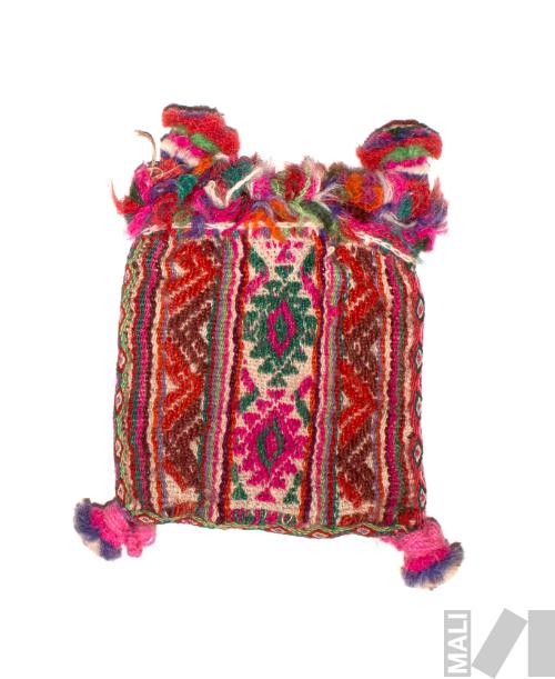 DescripciónTejido llano en fibra de oveja con cara de urdimbre y saltas con urdimbre suplementaria de dos colores; fondo blanco; rayitas rosado, najanra, morado, verde oscuro y claro, tierra; saltas verde, rosado con blanco, naranja, tierra, con blanco; ribete y flecos de losmismos colores; trama blanca