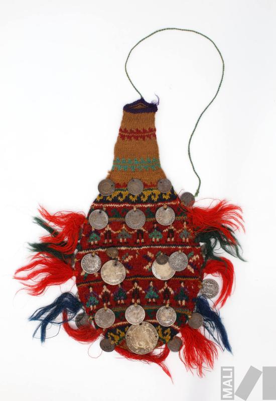 Descripción Tejido a palos en fibra de alpaca y vicuña; rojo, azul, verde, blanco, amarillo, verde claro, fushia; flecos y monedas cosidas encima de una cara, hilo doble para amarrar Anónimo - Aymara