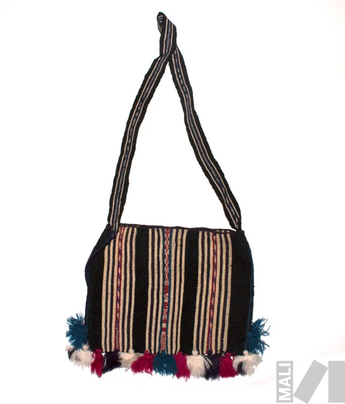 DescripciónTejido llano en fibra de alpaca con cara de urdimbrey saltas con urdimbre complementaria simple; pampa negra; rayitas blanco, morado/negro (n/m); saltas azul, rosado oscuro con blanco; borde azul; ribete m/n; cinta : negra, rayitas blancas, m/n y saltas azul con blanco; flecos rosado morado, blanco, azul; saltas de 2 (quicha palomita) y 6 pares; ribete tejido; y flecos; trama en Z