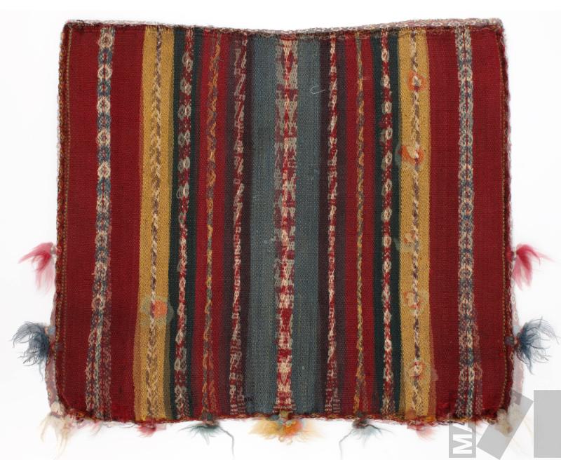 DescripciónTejido llano en fibra de alpaca con cara de urdimbre y saltas con urdimbre complementaria simple; pampa rosado oscuro; rayas amarillo, verde, celeste, morado; saltas celeste, morado, rosado oscuro, con blanco, verde con amarillo; ribete rosado oscuro con morado, blanco y amarillo; trama café; saltas geométricas (tara sellano - 8 pares, nayra, quicha palomita antigua - 3 pares) y saltas con mujer y patos; decoración de tela cosida encima, flecos y ribete tejido con ojos