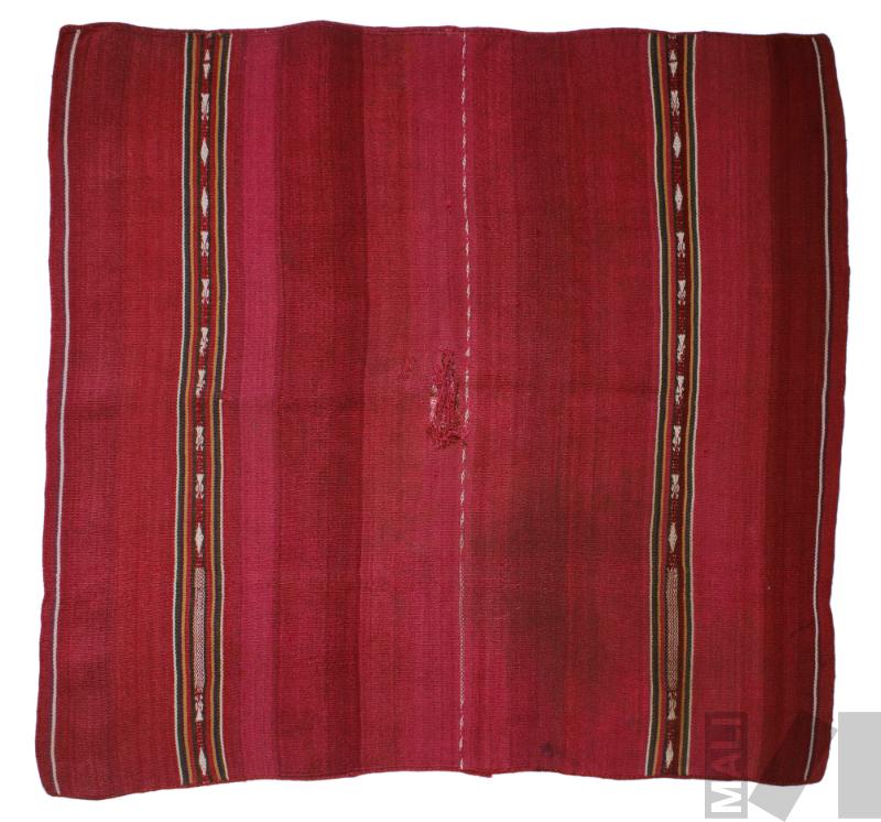 DescripciónTejido llano en fibra de alpaca con cara de urdimbre y saltas con urdimbre complementaria simple; pampa rosada; rayitas a los costados morado y blanco; listitas: morado, blanco, verde, amarillo, rosado claro y oscuro; saltas rosado oscuro con blanco; trama jaspeada café con rosado oscuro; ribete tejido del mismo color que la pampa; saltas de 2 y de 8 pares típicas de la zona de Juli