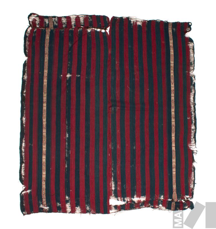 Descripción Tejido llano en fibrade alpaca con cara de urdimbrey saltas con urdimbre complementaria simple; rayas anchas azul y rosado oscuro; saltas blancas; borde azul trama café/negro; saltas grandes, varias con parejas Anónimo - Aymara