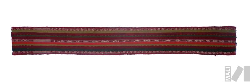 DescripciónTejido llano en fibra de alpaca con cara de urdimbre y saltas con urdimbre complementaria simple; rayas rosado oscuro, morado oscuro y claro (desteñido), verde oscuro, mediano, claro), salmon; saltas: rosado oscuro con blanco, con amarillo, y verde