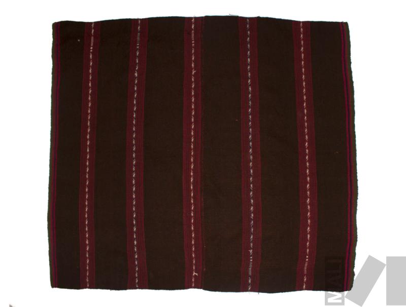 DescripciónTejido llano en fibra de alpaca con cara de urdimbre y saltas con urdimbre suplementaria flotante; pampa café; borde con rayas verde, rosado oscuro, azul y rosado oscuro; rayitas rosado oscuro alternando con café; saltas rosado oscuro o morado, con blanco;