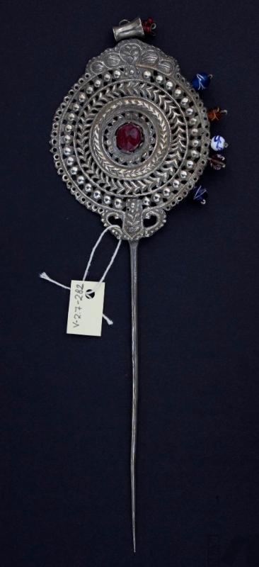 DescripciónTupu. La parte superior es de forma circular y tiene decoración con formas simétricas caladas, hacia el lado derecho cinco cuentas adornan el exterior de la circunferencia. Está rematada con un recipiente adornado con cuentas rojas. La parte inferior termina en un alfiler.
