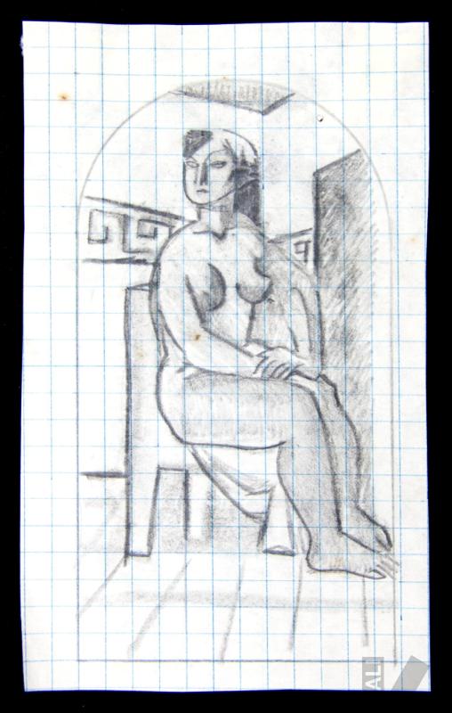 DescripciónObra de formato rectangular vertical. Composición en base a personaje femenino sedente desnuda, se encuentra sobre una silla en cuerpo entero en posición de tres cuartos, tiene las manos sobre el regazo la cabeza girada a la izquierda y la cabellera larga hacia atrásESTATUS