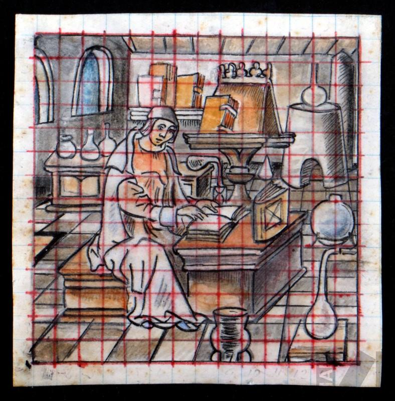 DescripciónObra de formato cuadrangular. Composición en base a personaje sedente, en tres cuartos a la derecha y en cuerpo entero. En primer plano se observa recipiente circular, en segundo plano se encuentra el personaje principal, tiene el cabello lacio a la altura del cuello. Sus brazos están sobre la mesa, abriendo un libro, viste con sombrero y saya de estilo medieval con mangas largas. En tercer plano un libro sobre un taburete y recipientes químicos