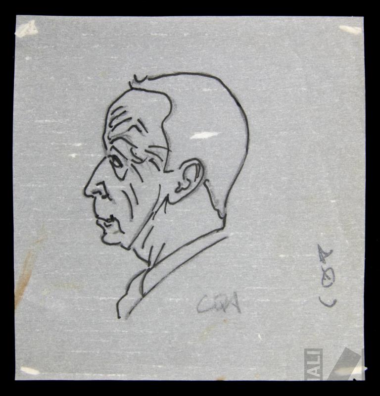 DescripciónObra de formato cuadrangular. Composición en base a busto de personaje masculino de perfil a la izquierda. Tiene el cabello corto, frente amplia y presenta arrugas en el rostro. Viste con camisa y corbata