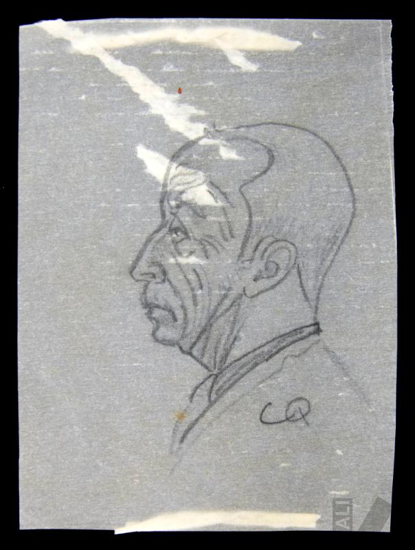 DescripciónObra de formato rectangular vertical. Composición en base a busto de personaje masculino de perfil a la izquierda. Tiene el cabello corto, frente amplia y presenta arrugas en el rostro. Viste con saco, camisa y corbata