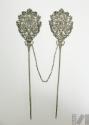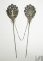 DescripciónPar de tupus unidos por cadena. Cada tupu presenta motivo central de tres ramas de terminación foliar sobre campo de rocallas. De la base emerge vástago plano con decoración vegetal incisa con volutas laterales donde de cada tupu se proyecta cadena que les une. la segunda sección del vástago, se proyecta de forma tubular y de terminación aguda.