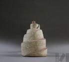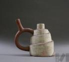Botella escultórica que representa una pirámide escalonada con acceso en rampa