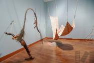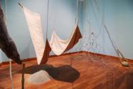 Instalación de tela de algodón teñida con barro, troncos ensamblados con tejido de junco, cerámica, sogas tejidas con palmera, arena y piedra