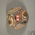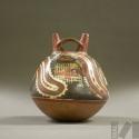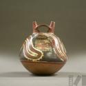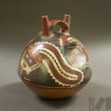 DescripciónBotella de labio recto. borde convergente, doble gollete cónico, asa puente cintada y cuerpo esferoide ligeramente carenado y base convexa. Posee la parte media superior del cuerpo decorado con la representación de un personaje con rasgos de felino y serpiente, además de diseños de serpientes y arañas sobre sus telarañas. Las cabezas de las serpientes se encuentran definidas como aplicaciones en la vasija. Estos diseños se encuentran dispuestos en todo el cuerpo sobre un fondo de color marrón oscuro. Las representaciones decorativas son de color: marrón rojizo, marrón oscuro, naranja, beige, negro y blanco.ESTATUS