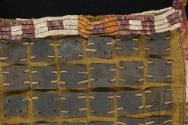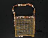 DescripciónChuspa con aplicaciones de cuentas y pequeñas láminas de metal en forma cuadrangular sujetas al textil. Presenta asaESTATUS