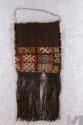 DescripciónChuspa con asa trenzada y cuerpo con diseños geométricos en la zona media inferior. Presenta flecos en el extremo inferiorESTATUS