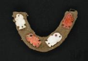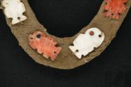 DescripciónAdorno en forma de herradura forrada con tela llana. Presenta cuatro aplicaciones de Spondylus y Strombus tallados en forma de peces sujetos al textilESTATUS