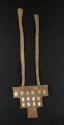 DescripciónTaparrabo de bordes escalonados con aplicaciones de Spondylus, Strombus y concha de perla tallados en forma de peces sujetos al textilESTATUS