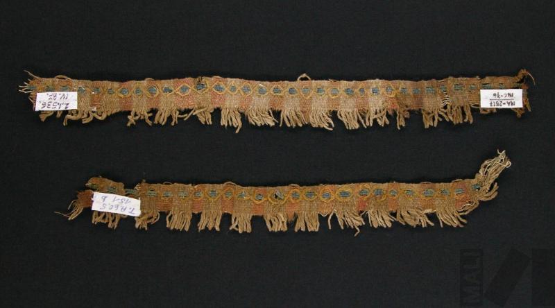 Fragmentos de cinta con decoración polícroma de diseños de rombos. Presenta flecos