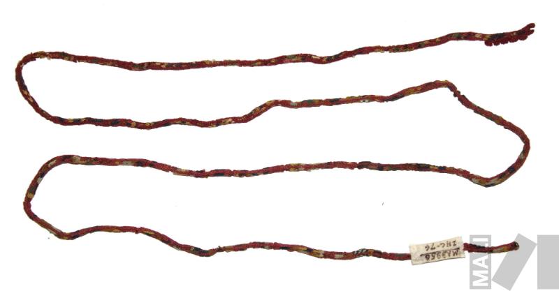 Cinta con hilos polícromos y flecos tejidos en un extremo